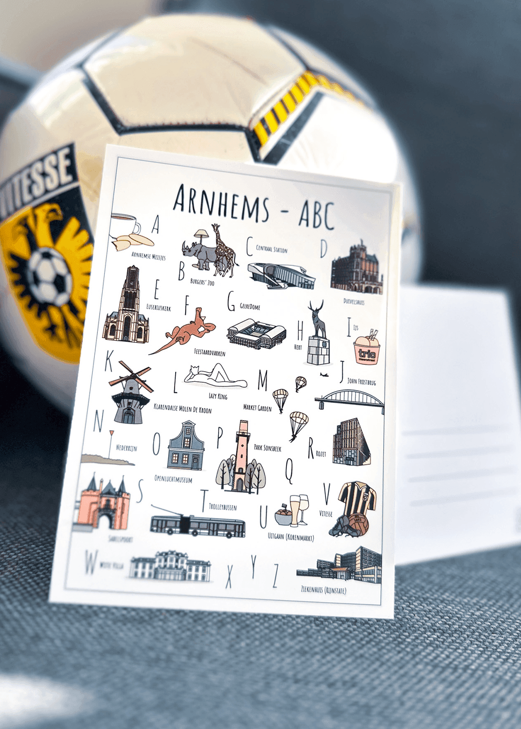 Alle illustraties zoals de Eusebiuskerk, Sabelpoort en Vitesse op de ABC ansichtkaart Arnhem zijn met de hand getekend. Het kleurenpalet bestaat uit zachte aardetinten die een harmonieus en rustgevend geheel vormen.