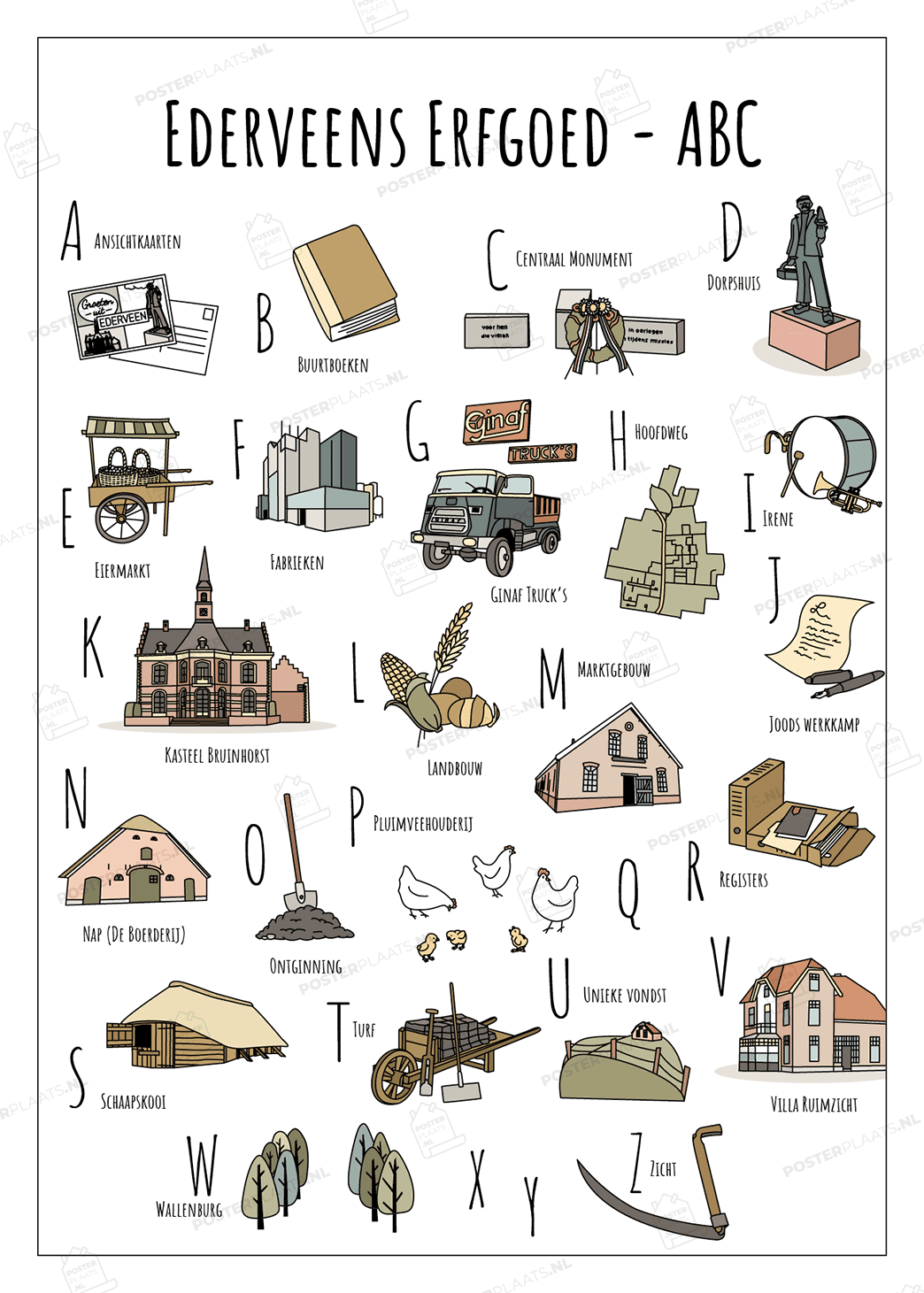 Op verzoek van Cultura is de ABC ansichtkaart van het Ederveens Erfgoed ontstaan. In eerste instantie als lesmateriaal en een mooie manier om lokaal erfgoed en kinderen te verbinden. Dit werd alleen zó enthousiast ontvangen dat de erfgoed posters en ansichtkaarten nu voor iedereen beschikbaar zijn! Een deel van inkomsten wordt weer gebruikt voor erfgoed educatie. Een mooi initiatief en leuk als cadeau of om te versturen.