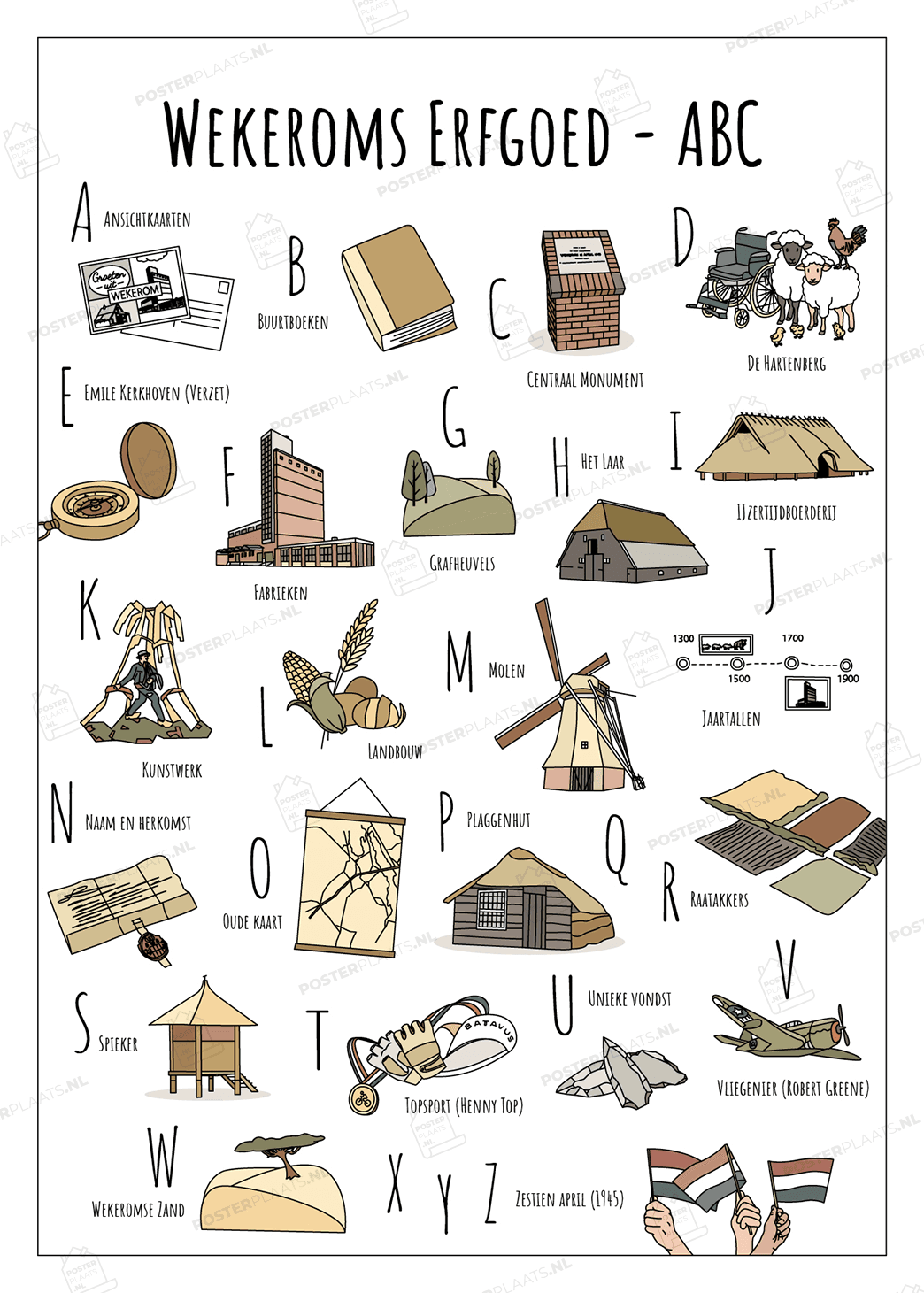 Op verzoek van Cultura is de ABC ansichtkaart van het Wekeroms Erfgoed ontstaan. In eerste instantie als lesmateriaal en een mooie manier om lokaal erfgoed en kinderen te verbinden. Dit werd alleen zó enthousiast ontvangen dat de erfgoed posters en ansichtkaarten nu voor iedereen beschikbaar zijn! Een deel van inkomsten wordt weer gebruikt voor erfgoed educatie. Een mooi initiatief en leuk als cadeau of om te versturen.