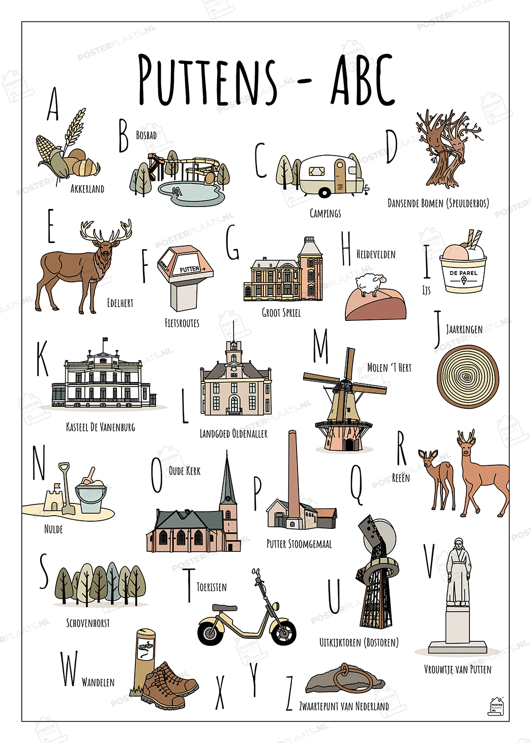 Alle illustraties zoals het Bosbad, Kasteel De Vanenburg en het Vrouwtje van Putten op de ABC poster Putten zijn met de hand getekend. Het kleurenpalet bestaat uit zachte aardetinten die een harmonieus en rustgevend geheel vormen.